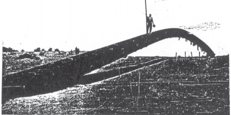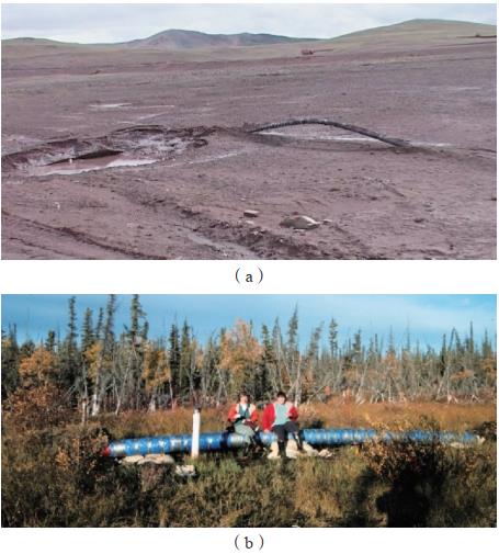 當埋地管道的輸送介質(zhì)或工作溫度大于施工溫度時,管道將受軸向壓應力作用而可能產(chǎn)生軸向失穩(wěn)屈曲。由于土壤阻力的原因,該失穩(wěn)屈曲往往向上,常被稱為翹曲上拱。在格拉管道、Norman Wells輸油管道,以及俄羅斯、伊朗、阿聯(lián)酋等國管道都出現(xiàn)過翹曲上拱。格拉管道沿線烏麗附近有大量凍脹,使得屈曲后的管道最大上浮位移達1.9 m,地面屈曲長度約3.6 m(圖 1(a))。Norman Wells輸油管道在施工和運行中都因凍脹和融沉發(fā)生過翹曲上拱(圖 1 (b))。烏茲別克斯坦一條管徑1020 mm管道曾發(fā)生大位移翹曲上拱,如圖 2所示。
