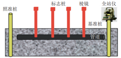 (3)管道位移監(jiān)測。在監(jiān)測區(qū)域安裝基準樁,在待監(jiān)測管道安裝標志樁,定期測量各標志樁的坐標,若管道發(fā)生位移,則標志樁的坐標發(fā)生變化,兩次時間間隔的坐標變化即為該時間間隔內(nèi)管道的位移。監(jiān)測原理如圖 5所示。
