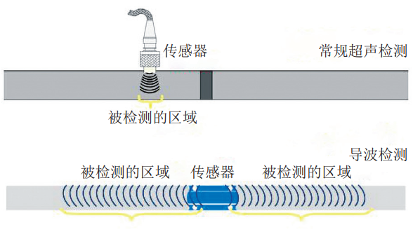 超聲導(dǎo)波與傳統(tǒng)超聲波傳播方式不同,其傳播方向不指向介質(zhì)邊界,而是與邊界平行,是整個介質(zhì)厚度范圍內(nèi)各質(zhì)點振動的結(jié)果,沿傳播路徑衰減小,傳播距離遠(yuǎn),可沿構(gòu)件傳播幾十米至上百米的距離,覆蓋范圍廣,聲場可覆蓋整個介質(zhì)。適用于長距離、大范圍缺陷檢測。