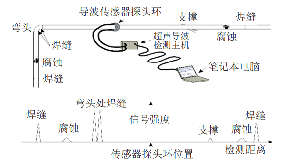 超聲導(dǎo)波在進行管道檢測時,導(dǎo)波沿管壁傳播,在管壁橫截面發(fā)生變化處產(chǎn)生反射信號。反射信號的幅度與管壁橫截面積的總變化量有關(guān),通過分析解讀該信號即可判斷管道特征及狀態(tài)。