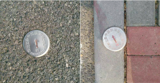 此外,在道路兩側設置高后果區(qū)標示牌、警示牌,在路面布設管道標識(圖 2)。與道路管理部門建立聯(lián)動機制,如遇道路建設施工提前與管道企業(yè)聯(lián)系,由專業(yè)人員探測確認管道準確位置和埋深,做好安全防護。管道巡護人員與道路巡護人員建立聯(lián)系,巡檢過程中發(fā)現(xiàn)問題相互通報,信息共享,共保雙方設施安全。