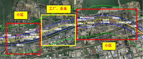 圖 2為某高后果區(qū)影像圖,紅框內(nèi)為小區(qū),四層及以上構(gòu)筑物;兩紅框中間黃框區(qū)域?yàn)槠髽I(yè)、工廠,最高為三層構(gòu)筑物,紅框與黃框區(qū)域識(shí)別為一整個(gè)Ⅲ級(jí)高后果區(qū),但僅對(duì)紅框內(nèi)區(qū)域按Ⅲ級(jí)高后果區(qū)管理,黃框內(nèi)區(qū)域按Ⅱ級(jí)高后果區(qū)管理。