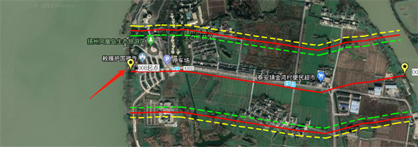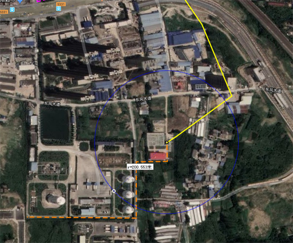 圖 5為某高后果區(qū)影像圖,黃色實(shí)線終點(diǎn)的黑色圓圈為某場(chǎng)站位置,場(chǎng)站為管道終點(diǎn),則此高后果區(qū)至場(chǎng)站后仍需外延200 m,終點(diǎn)樁號(hào)定為場(chǎng)站+200 m。