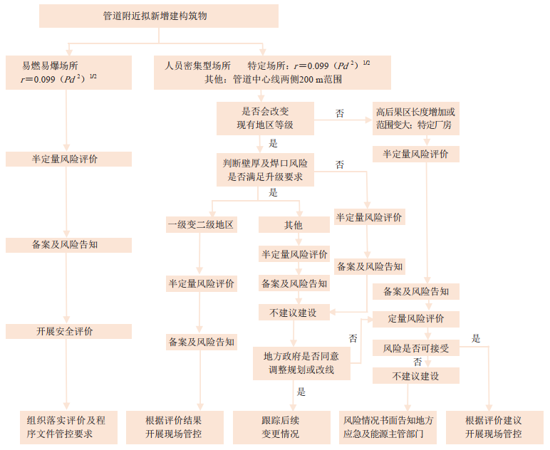 公司開展周期性管道周邊規(guī)劃信息收集,預(yù)先識別高后果區(qū)新增及存量變化情況。當管道附近新增建構(gòu)筑物足以改變現(xiàn)有地區(qū)等級,或?qū)е略懈吆蠊麉^(qū)增長(包括長度增長、特定場所形成或常住人口數(shù)量增加等情況),或新增易燃易爆場所時,要通過影響分析、風險消減、備案及風險告知、定量風險評價、實施管控等五個環(huán)節(jié)開展管理工作。風險評價報告請縣級以上地方政府管道保護主管部門牽頭組織審查。對于風險評價為不可接受的管段,向當?shù)卣埵緟R報,主動協(xié)調(diào)重新選址或調(diào)整布局。對于風險評價為可接受的管段,通過協(xié)商近管道一側(cè)土地規(guī)劃布局及用途等,減少雙方的相互疊加風險,降低管道事故狀態(tài)對周邊人員和財產(chǎn)的潛在后果影響。對于風險評價需要采取措施方可接受的管段,通過實施腐蝕防護、管道環(huán)焊縫專項整治、地質(zhì)災(zāi)害防治、第三方施工防控、安全保衛(wèi)等措施,并優(yōu)化管道周邊用地性質(zhì)以降低風險。具體流程如圖 1所示。