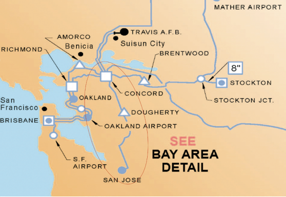 2020年11月20日,金德摩根(Kinder Morgan)所轄LS-16成品油管道在加利福尼亞州康特拉科斯塔縣(Contra Costa)發(fā)生一起重大泄漏事故,初步估計泄漏量750~1000桶(50桶以上為重大事故),未起火,未造成人員傷亡。LS-16成品油管道全長82.7 km,建于1960年代,管徑254 mm,設計壓力9 MPa,管道輸量約4483桶/h,沿線設5座閥室(圖 1)。