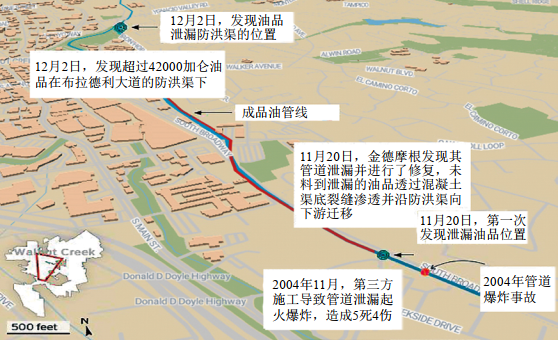 20日15:00控制室發(fā)現(xiàn)事故管段壓力波動,但巡線隊未發(fā)現(xiàn)泄漏跡象;直到24日22:03發(fā)現(xiàn)漏點,開挖檢查發(fā)現(xiàn)管道出現(xiàn)139.7 mm(5.5 in)裂紋, 并報告OES/NRC(州應急服務中心/國家應急中心);26日管線經(jīng)換管處置重新啟輸。12月2日,在距離泄漏點下游2.4 km處防洪排水渠發(fā)現(xiàn)大量油品,經(jīng)大范圍檢測確定管道未發(fā)生二次泄漏,是11月20日管道泄漏油品遷移至此(圖 2、圖 3)。