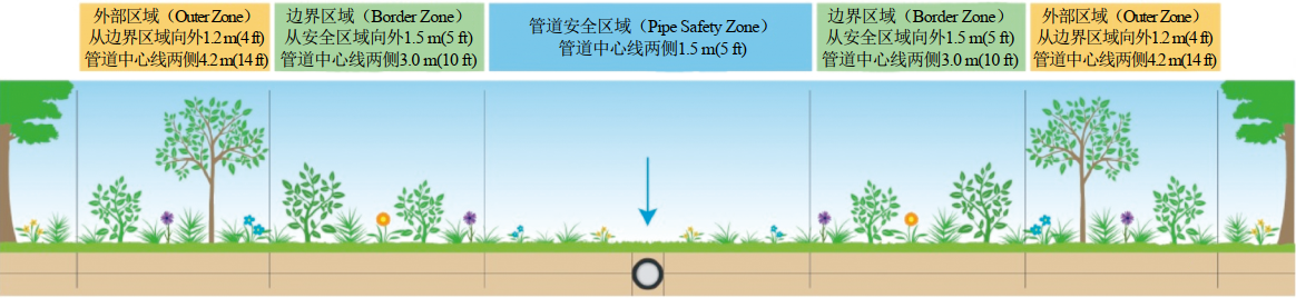 (2)管道邊界區(qū)域(Border Zone):從管道安全區(qū)域邊緣向外1.5 m(5 ft)。不得種植直徑超過0.2 m(8 in)或胸徑可能超過0.2 m(8 in)、其主干或主分支距管道中心線超過1.5 m~3.0 m(5 ft~10 ft)的樹木和植物。
