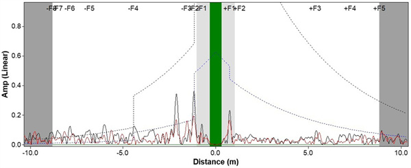 使用超聲導波檢測設備可實現(xiàn)對場站壓力管道內(nèi)外檢測面100%覆蓋檢測,檢測過程如圖 2所示。在超聲導波傳感器使用L波模式產(chǎn)生L(0, 2)測量波時,遇到管壁內(nèi)外表面壁厚存在變化時(壁面因腐蝕產(chǎn)生金屬損失),將產(chǎn)生F(1, 3)波并返回;在超聲導波傳感器使用T波模式產(chǎn)生T(0, 1)測量波時,遇到管壁內(nèi)外表面壁厚存在變化時(壁面產(chǎn)生金屬損失),將產(chǎn)生F(1, 2)波并返回。通過檢測返回波F(1, 3)和F(1, 2)的信號大小,再依據(jù)L(0, 2)和T(0, 1)測量波的傳播速度,可計算得到缺陷在管道的位置和大小信息。