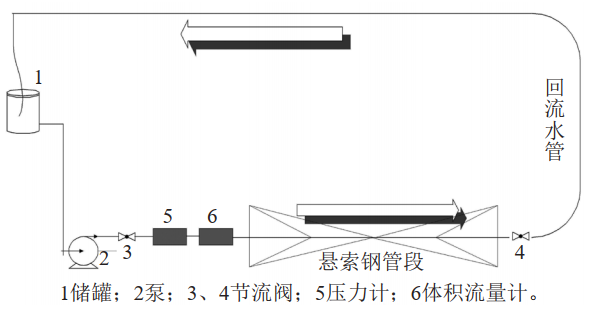 相似實(shí)驗(yàn)平臺(tái)見圖 2,主要由介質(zhì)循環(huán)系統(tǒng)和數(shù)據(jù)測(cè)試系統(tǒng)兩部分組成。介質(zhì)循環(huán)系統(tǒng)包括介質(zhì)儲(chǔ)存罐1、離心泵2、節(jié)流閥3、壓力計(jì)5、體積流量計(jì)6、節(jié)流閥4和回水管。由于懸索跨越管道具有對(duì)稱性,取管道中心為軸向原點(diǎn),沿介質(zhì)流向?yàn)檎,逆介質(zhì)流向?yàn)樨?fù),實(shí)驗(yàn)管路前端設(shè)計(jì)流量控制回路,用于調(diào)節(jié)管內(nèi)介質(zhì)流速。數(shù)據(jù)測(cè)試系統(tǒng)包括若干光纖光柵應(yīng)變傳感器、數(shù)據(jù)傳輸線和數(shù)據(jù)采集儀。
