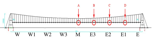 在懸索跨越實(shí)驗(yàn)平臺(tái)單側(cè)管體上等距離選擇4個(gè)測(cè)點(diǎn),分別測(cè)試管體環(huán)向4個(gè)方向的微應(yīng)變情況。每個(gè)測(cè)點(diǎn)分別布設(shè)4個(gè)傳感器(上、下、北、南),以及溫度補(bǔ)償傳感器。根據(jù)對(duì)稱原理,全橋共獲取7個(gè)等間距位置的應(yīng)變數(shù)據(jù),如圖 3所示。