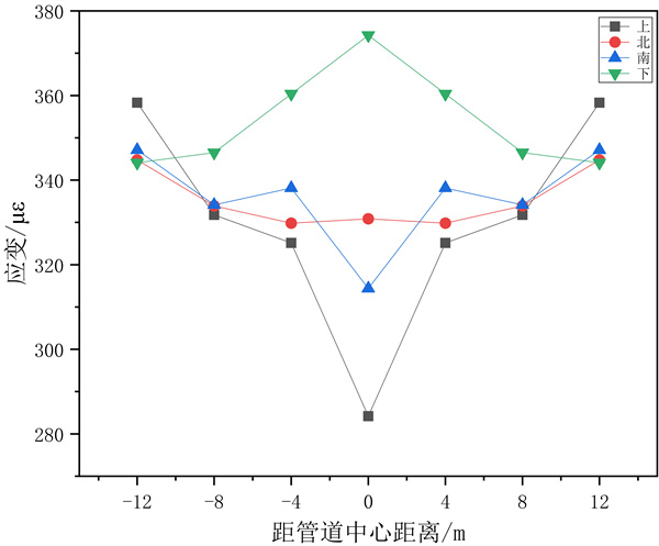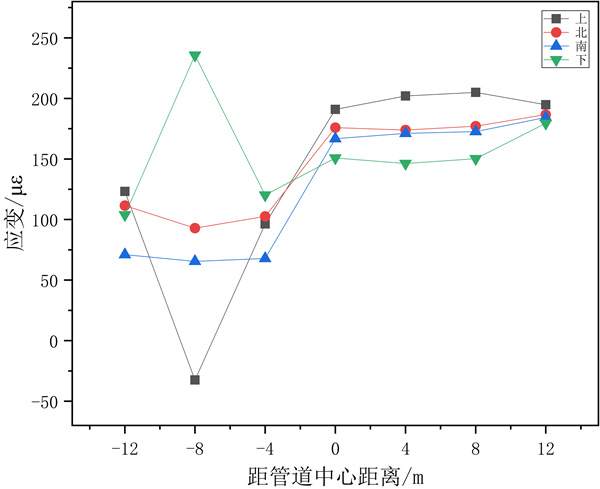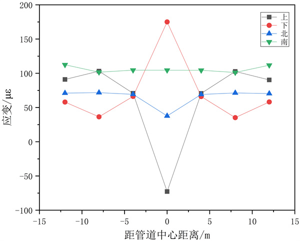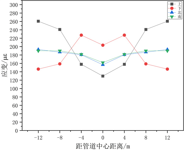 集中載荷F3作用條件下,最大應(yīng)變值240με,在距管道中心﹣8 m位置處,即管道1/4處。管道開始端比結(jié)束端應(yīng)力值小,與無集中載荷作用時(shí)相比,管道中點(diǎn)的應(yīng)變值略微增大,而管道開始端的應(yīng)變值則變小,結(jié)束端則變大。