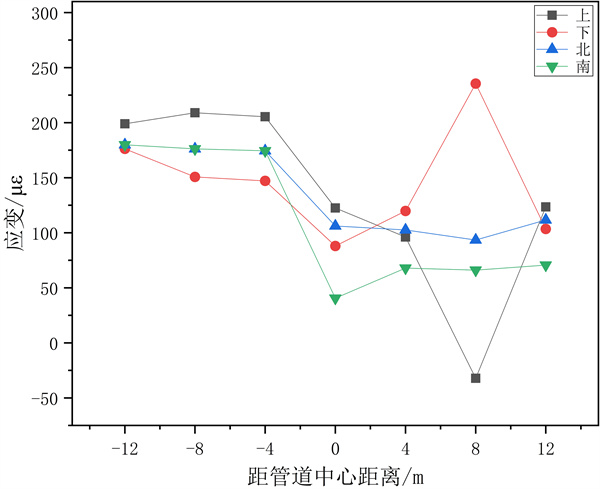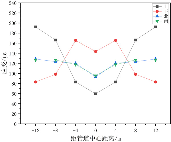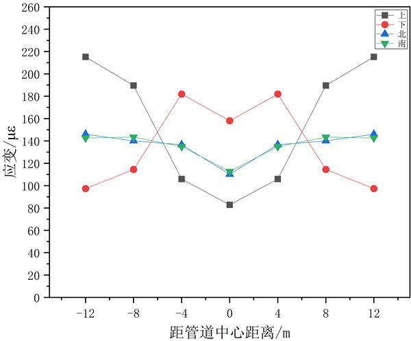 集中載荷F2作用條件下,最大應(yīng)變值240με,在距管道中心8 m位置處,即管道3/4處。管道開始端比結(jié)束端應(yīng)力值大,與無集中載荷作用時(shí)相比,管道中點(diǎn)的應(yīng)變值略微增大,而管道開始端的應(yīng)變值則變大,結(jié)束端則變小。