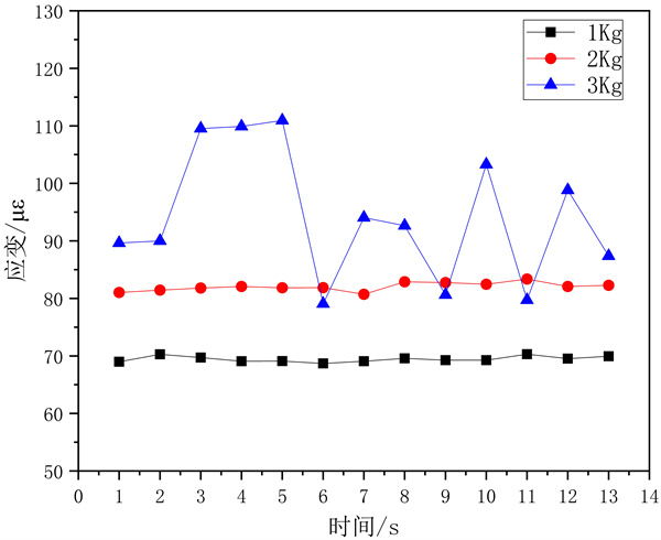 分別開展風(fēng)載及橫向拉力條件下的應(yīng)變實(shí)驗(yàn),測(cè)試各點(diǎn)應(yīng)變值。從圖 12可以看出,隨著風(fēng)速的增大,懸索管橋的應(yīng)變波動(dòng)更明顯,由于風(fēng)載作用的波動(dòng)性,使得局部應(yīng)力數(shù)值較小。由于實(shí)驗(yàn)中風(fēng)載作用面積有限,實(shí)際懸索管橋受到河面橫風(fēng)的作用產(chǎn)生的應(yīng)力波動(dòng)更為明顯。從圖 13可知,拉力作用產(chǎn)生的應(yīng)力波動(dòng)隨拉力增大而增大,相比風(fēng)載變化更為穩(wěn)定。當(dāng)拉力載荷為3 kg時(shí),懸索跨越管橋應(yīng)力波動(dòng)明顯增大。