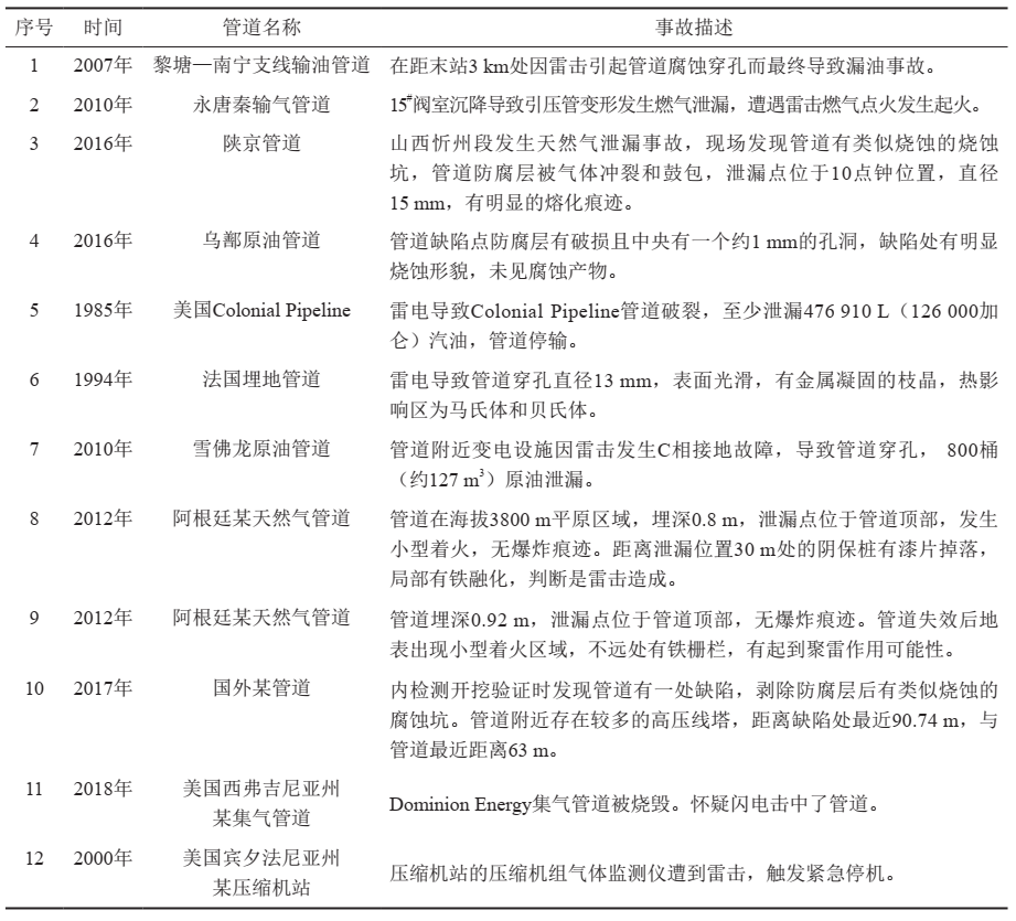 目前管道均按規(guī)范設計了防雷措施,但是近年來仍然發(fā)生多起因雷擊引起的管道燒蝕案例,造成的管道缺陷在防腐層內側存在碳化痕跡,且有金屬顆粒飛濺,目測深度也較深。國內外雷擊導致管道失效的部分案例如表 1所示。