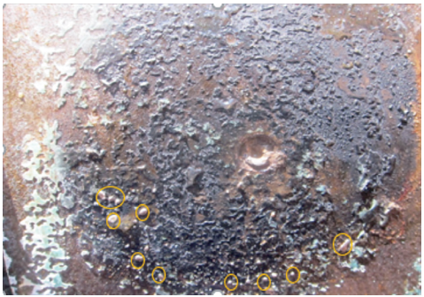 管道本體外表面有黑色環(huán)氧粉末熔化痕跡,缺陷附近有多顆圓型金屬顆粒,如圖 2圓圈標記所示,推測為該處管體缺陷在受熱形成期間管體金屬飛濺導致。通過實測圖 1(b)管道缺陷,其上下左右四個方向的尺寸均為11 mm;中間圓形缺陷的上下左右四個方向均為5 mm。同時,在該缺陷的外部邊緣,有金屬溢出凝固痕跡。由于現(xiàn)場未發(fā)現(xiàn)明顯腐蝕產物,同時有高溫熔化現(xiàn)象,因此可排除電化學干擾所致。