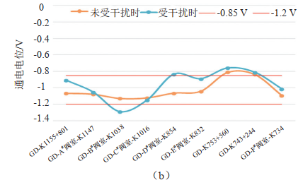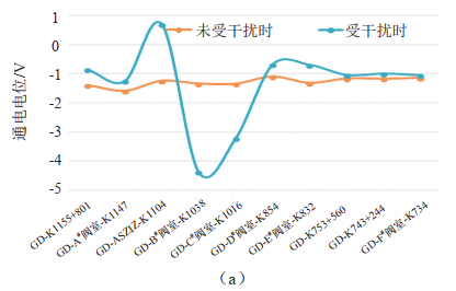 圖 2顯示在某一時間段某段山區(qū)管道受到高壓直流接地極干擾的情況,干擾持續(xù)時長為48 min,干擾類型為接地極陽極運行。從各監(jiān)測點的電位變化(圖 2(a)、圖 2(b))來看,此次高壓直流干擾導(dǎo)致至少10處監(jiān)測點的管道電位相對于未發(fā)生干擾時出現(xiàn)了偏移,影響管段約為400 km。GD-K1155+801~GD-A#閥室-K1147 管段和GD-D#閥室-K854~GD-F#閥室-K734 管段為電流流出段,電位正向偏移,監(jiān)測點GD-D#閥室-K854的斷電電位正向偏移最大,最正通/斷電電位為﹣0.685 V/﹣0.834 V,斷電電位不滿足最小保護電位要求。GD-B#閥室-K1038~GD-C#閥室-K1016 管段為電流流入段,電位負向偏移,監(jiān)測點 GD-B#閥室-K1038 的斷電電位負向偏移最大,最負通/斷電電位為﹣4.378 V/﹣1.291 V,斷電電位負于限制臨界電位。