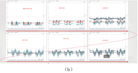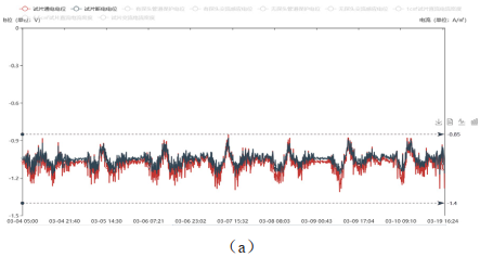 圖 3為某山區(qū)管段連續(xù)監(jiān)測的管道通/斷電電位隨時間變化曲線。從圖 3(a)可以看出,管段受到典型的動態(tài)雜散電流干擾而電位波動,每天夜間管道電位波動消失。根據(jù)管段附近用電設(shè)施調(diào)查,可以判斷雜散電流來源為管道附近企業(yè)用電設(shè)備。圖 3(b)為管段K1062-K1168陰保監(jiān)測的曲線圖,可以看出越向下游方向,監(jiān)測點的波動幅度越大,可以肯定雜散干擾也越大。