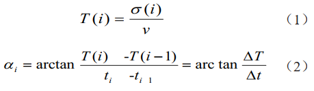 式中:σ( i )為勻速變形某一單位時(shí)間段(一般采用一個(gè)監(jiān)測周期,如1天、1周等)內(nèi)管道應(yīng)力增長量,MPa;v為勻速變形階段的應(yīng)力變化速率,MPa/周期;T( i )為變換后與時(shí)間相同量綱的縱坐標(biāo)值;αi為改進(jìn)的切線角,°;ti為某一監(jiān)測時(shí)刻;Δt為時(shí)間段;ΔT為Δt時(shí)間段內(nèi)T( i )的變化量。