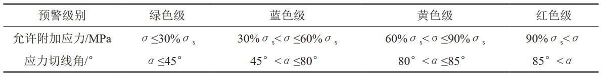 根據(jù)文獻(xiàn)[5],滑坡在初始變形階段時(shí),切線角為小于45°,到等速變形階段,切線角約等于45°,這兩種變形狀態(tài)下管道都處于相對(duì)安全的狀態(tài),預(yù)警為綠色級(jí);滑坡初加速階段時(shí),切線角大于45°,報(bào)藍(lán)色級(jí)預(yù)警;中加速階段時(shí),切線角變化約為80°到85°,報(bào)黃色預(yù)警;當(dāng)切線角大于85°時(shí)報(bào)紅色預(yù)警?紤]到管道應(yīng)力變化時(shí)管道的安全性,將管道預(yù)警附加應(yīng)力與切線角預(yù)警級(jí)別相結(jié)合,以最不利原則作為管道力學(xué)預(yù)警模型的最終級(jí)別,如表 1所示。