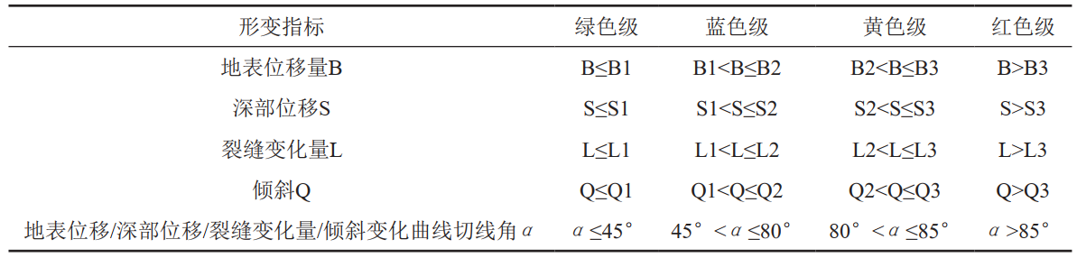 滑坡監(jiān)測可能安裝多種不同類型的監(jiān)測設(shè)備,且因每個(gè)滑坡具有獨(dú)特性,預(yù)警判據(jù)值需根據(jù)監(jiān)測滑坡點(diǎn)位的具體現(xiàn)場工況綜合提出。本文沿用改進(jìn)切線角方法求取的滑坡地表位移切線角、深部位移切線角、裂縫切線角以及傾斜量切線角作為每一種監(jiān)測設(shè)備的單指標(biāo)預(yù)警判據(jù),每個(gè)判據(jù)均包含綠色級(jí)、藍(lán)色級(jí)、黃色級(jí)和紅色級(jí),如表 2所示。而滑坡的綜合預(yù)警等級(jí)的確定采用最不利原則,將多種監(jiān)測設(shè)備所達(dá)到的最高預(yù)警級(jí)別作為滑坡綜合預(yù)警等級(jí)。