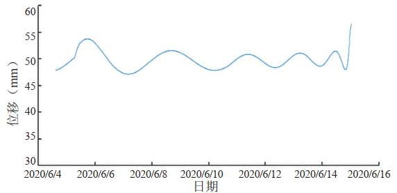 選取6月上旬到發(fā)生預(yù)警時(shí)間段的地表位移計(jì)監(jiān)測值進(jìn)行分析(圖 2),經(jīng)切線角理論改進(jìn)得到的T- t 曲線與相應(yīng)的切線角(圖 3),管道應(yīng)力值曲線(圖 4),轉(zhuǎn)化得到的T- t 曲線與切線角曲線(圖 5)。