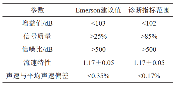實時監(jiān)測5個基本參數(shù)值并與Emerson廠家建議的診斷參數(shù)標準對比,可以發(fā)現(xiàn)流量計各聲道相應(yīng)數(shù)據(jù)與診斷指標的差異,據(jù)此可初步判斷數(shù)據(jù)異常聲道可能存在臟污或探頭故障等,需對相應(yīng)探頭進行拆檢,清除探頭表面臟污或者更換、調(diào)整探頭參數(shù)。定期進行聲速核查,基本可以辨別超聲波流量計的整體表現(xiàn)。Emerson廠家建議的診斷參數(shù)標準如表 1所示。