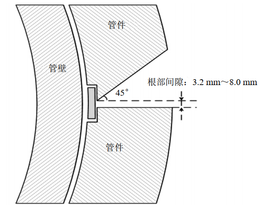 (2)接頭設計。全包式管件上下護板的倒角和坡口形式[3]規(guī)定,上護板坡口為45°,下護板無坡口,橫焊縫根部的間隙應控制在3.2 mm~8.0 mm之間[3],橫焊縫接頭設計形式如圖 1所示。
