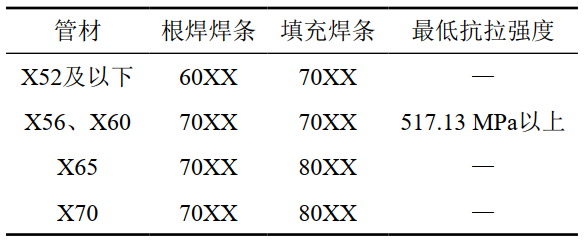 (4)焊條選型。阿美標準規(guī)定在役焊接一般采用低氫堿性焊條而不用纖維素焊條,不同鋼材等級管道應選擇的焊條最低抗拉強度[2]如表 2所示。