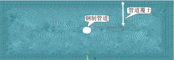 由于管道下部欠固結土的不均勻沉降,將引起其中敷設管道的受力不均。對于填方4 m(H1)和14 m(H2)的土體,其沉降值有明顯差異,如表 2所示。本文采用有限元計算方法(圖 2),計算不同高度回填土的土體沉降值和由此產(chǎn)生的管道附加應力值。