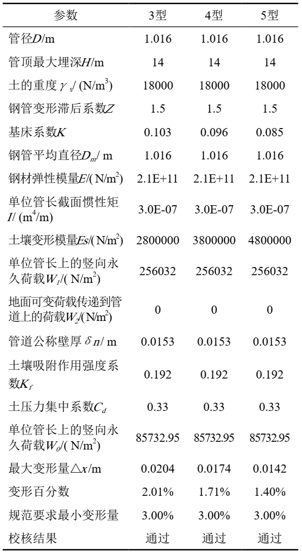 通過馬斯頓模型計算可知,在各種敷設條件下,管道最大變形值為2.01%,小于規(guī)范 3%變形允許值,管道徑向穩(wěn)定性滿足安全要求。