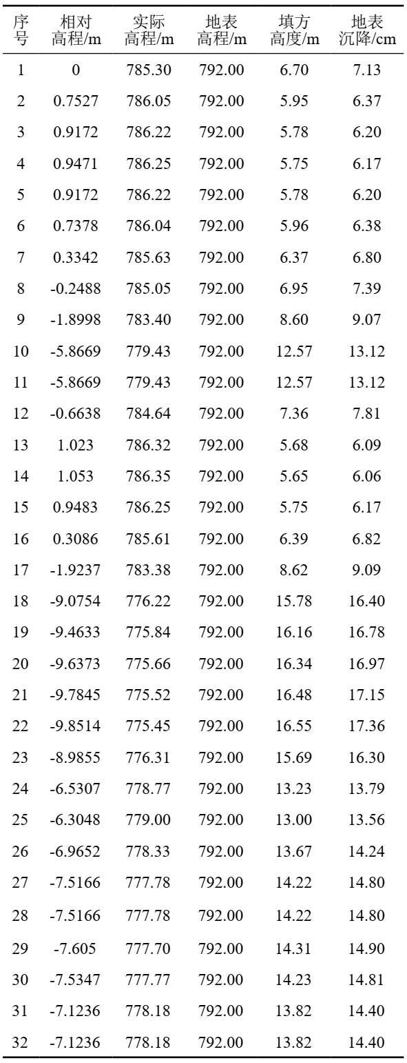 根據(jù)有限元應變計算結果,得到不同高度填方的管道關鍵節(jié)點處地表沉降值,如表 4所示。