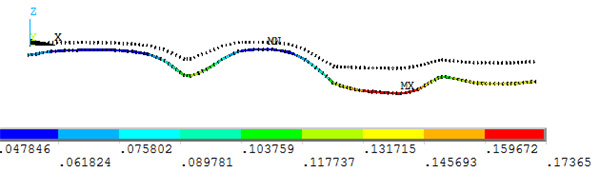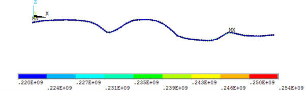 高填方區(qū)管道除了受內(nèi)壓、溫差、走向變化影響外,同時受土體不均勻沉降的作用;輸氣管道最大位移范圍為0.04 m~0.17 m,最大應力點組合應力值為254 MPa(圖 5),最大組合應力雖略有增高,但遠小于X80鋼管材質(zhì)允許極限應力值(499.5 MPa),可判定管道運營處于安全狀態(tài)。