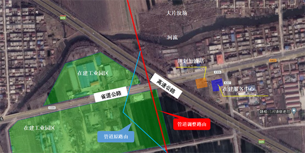 (1)中俄東線(永清—上海)江蘇段在施工設(shè)計及外協(xié)征地期間,地方相關(guān)部門提出管道所處某區(qū)域已經(jīng)規(guī)劃為工業(yè)園區(qū)招商引資,要求管道進(jìn)行避讓。同時管道路由東側(cè)擬規(guī)劃建設(shè)政府行政服務(wù)中心和加油站。經(jīng)過多次組織現(xiàn)場踏勘和特定場所復(fù)核,確;A(chǔ)數(shù)據(jù)資料準(zhǔn)確無誤后,從確保本質(zhì)安全和公共安全出發(fā)調(diào)整了管道路由設(shè)計。如圖 2所示。