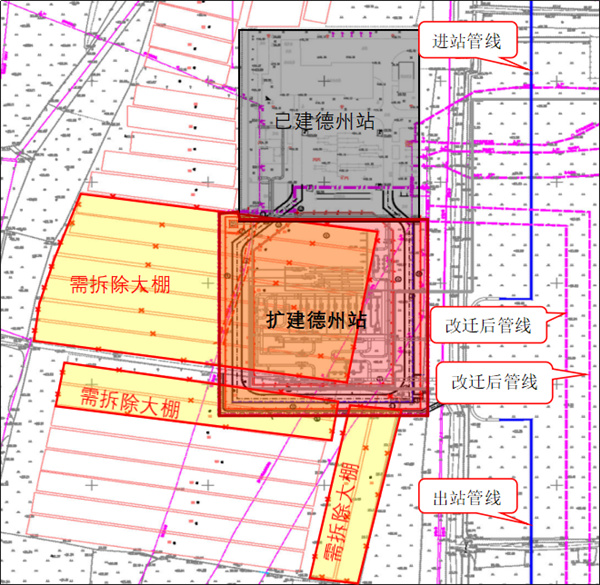 (3)中俄東線(永清—上海)德州站在已建站場基礎(chǔ)上擴(kuò)建,新場區(qū)選址主要為麥地。用地預(yù)審調(diào)規(guī)已按照相關(guān)規(guī)定完成,并獲得國家發(fā)改委核準(zhǔn)批復(fù)。在項目推進(jìn)過程中發(fā)現(xiàn)站址用地范圍和進(jìn)出站管線路由地面附著物已全部為葡萄大棚。為了降低對農(nóng)業(yè)生產(chǎn)的影響,調(diào)整了進(jìn)出站管線方向。如圖 3所示。