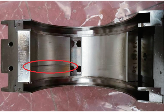 (5)人工檢查,當(dāng)軸承瓦塊巴氏合金結(jié)合面發(fā)現(xiàn)紅色剝離痕跡時,表明瓦塊存在缺陷需進(jìn)行更換(圖 3)。