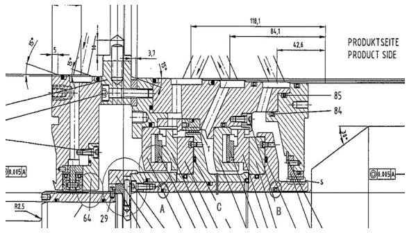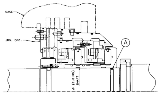 (1)故障描述。某機組運行過程中,巡檢人員在潤滑油箱內檢出高濃度天然氣,此時機組控制系統(tǒng)無任何報警信息。通過對干氣密封進行拆檢,發(fā)現(xiàn)軸套與主軸之間O型圈發(fā)生破損造成密封失效(圖 1 A點),高壓工藝氣沿主軸與軸套之間的間隙竄入潤滑油系統(tǒng),最終在油箱內產生聚積。