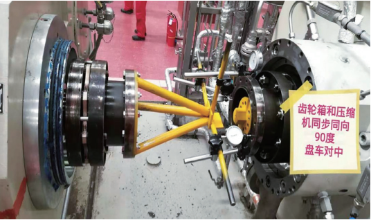 (6)找正完畢后,可以預(yù)組裝聯(lián)軸器。由于壓縮機(jī)、變速箱及電機(jī)等有各自獨(dú)立的推力系統(tǒng),必須按照壓縮機(jī)組圖紙要求預(yù)留聯(lián)軸器安裝間距,且此間距應(yīng)在各轉(zhuǎn)子主推力面上進(jìn)行測量,以保證其膨脹間隙,這一點(diǎn)對機(jī)組長周期運(yùn)行至關(guān)重要。
