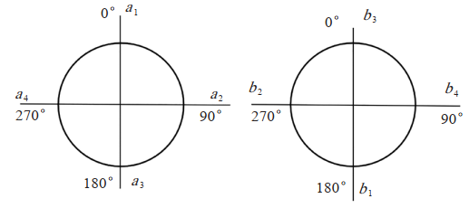 (2)按照齒輪箱旋轉(zhuǎn)方向盤車,旋轉(zhuǎn)至90°、180°、270°,分別記錄百分表讀數(shù)(圖 3, a、b各代表百分表測量的對中偏差值讀數(shù)),并計(jì)算得出偏差值S:S1=(a1+b3)/2;S2=(a2+b4)/2;S3=(a3+b1)/2;S4=(a4+b2)/2。