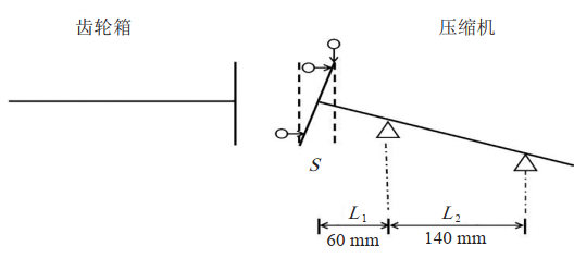 Y偏差調(diào)整量,mm;D為2塊百分表之間的距離,mm;L1前腳到測量點(diǎn)的距離,mm;L2后腳到前腳的距離,mm;S軸向偏差值,mm。