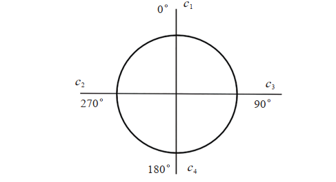(3)在壓縮機(jī)側(cè)半聯(lián)軸器端面標(biāo)記4個(gè)測量點(diǎn)。首先在上頂點(diǎn)標(biāo)記0°位置,然后使用鉛墜找到下底點(diǎn)標(biāo)記180°位置,接著用水平尺分別找到90°、270°位置做好標(biāo)記。標(biāo)記好的4個(gè)測量點(diǎn)保證為正圓的4個(gè)頂點(diǎn),上下和左右直徑相等,便于每次測量讀數(shù)時(shí)位置固定,減少測量誤差,保證測量精度。