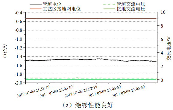 (2)交流干擾電壓測量法。測量閥室管道與接地扁鐵交流干擾電壓,若兩者差值較大,且接地扁鐵交流干擾電壓接近0,說明絕緣狀況良好;當(dāng)交流干擾存在時,兩者無明顯電位差,且兩者均受到交流干擾,這時絕緣是失效的。