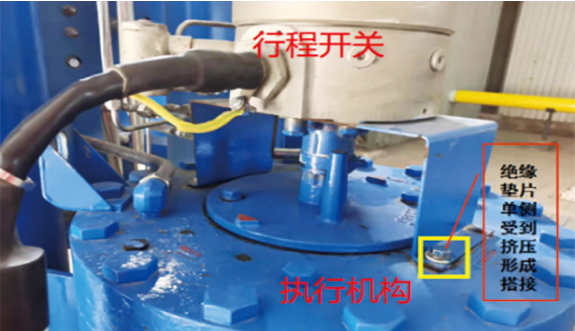 (1)閥門指示器端與管道主體之間設(shè)置絕緣用于閥室陰極保護(hù)系統(tǒng)與接地系統(tǒng)的電氣隔離。如執(zhí)行機構(gòu)端面的螺栓內(nèi)部未安裝絕緣件或絕緣件不合格都可能引起絕緣失效,導(dǎo)致管道與接地網(wǎng)導(dǎo)通(圖 3)。