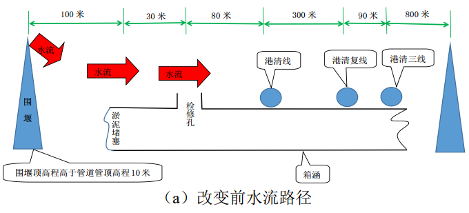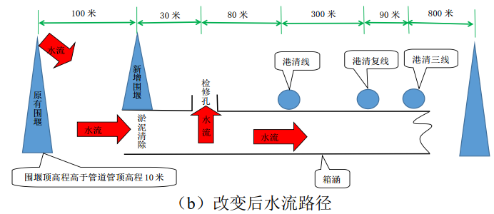 (1)連夜在來水方向修筑圍堰,疏通箱涵,使洪水改變路徑從箱涵的檢修孔出水進(jìn)入交叉施工作業(yè)坑內(nèi),防止作業(yè)坑周圍水壩抬高作業(yè)坑內(nèi)水的高程,降低洪水進(jìn)入作業(yè)坑的動能。如圖 1所示。