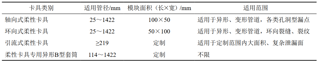 (3)柔性卡具特點。適用于各種形式的泄漏封堵,由于采用新型堵漏材料,柔性卡具與傳統(tǒng)的剛性卡具堵漏方式有很大區(qū)別, 整個施工作業(yè)無需動火, 施工作業(yè)面小,操作簡單、輕便、快捷[2]。由于柔性卡具變形量大,容讓性強,適合各種異形、變形管件及焊縫開裂造成的泄漏,管徑覆蓋DN25~DN1400的陸上、水下管道等各種泄漏的封堵處理。通過采用不同材質(zhì)的柔性卡具,也可適應(yīng)負(fù)190℃到200℃的管道介質(zhì)溫度。