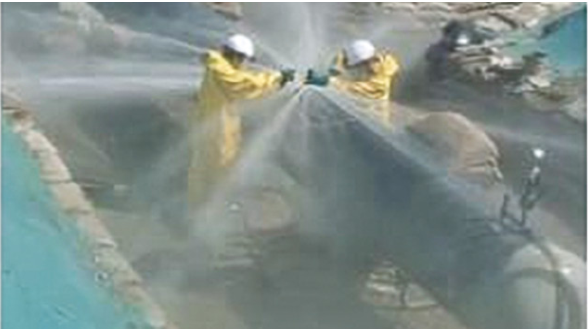 (3)用于大面積復(fù)雜泄漏。在管道出現(xiàn)大面積、不規(guī)則、多孔洞復(fù)雜泄漏情況下,剛性卡具還是傳統(tǒng)柔性卡具都無計可施,新型引流式柔性卡具很好地解決了這個難題。它通過密封模塊將泄漏介質(zhì)密封在模塊的腔室內(nèi),然后通過引流裝置將泄漏介質(zhì)收集于外置的大型容器內(nèi),從而將不可控的泄漏狀態(tài)轉(zhuǎn)向可控狀態(tài),為后期進一步處理爭取時間。在現(xiàn)場測試時展現(xiàn)了良好的性能,在3 MPa運行壓力下,引流、密封均正常(圖 4)。