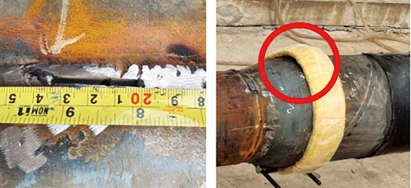 (2)用于焊縫、焊趾泄漏。傳統(tǒng)軸向式柔性卡具,因其設(shè)計初衷針對腐蝕穿孔造成的泄漏事故,不適于焊縫開裂泄漏的封堵。環(huán)向柔性卡具專門應(yīng)對由裂紋引起的泄漏事故,經(jīng)測試,使用新型環(huán)向式柔性卡具進行焊縫焊趾處的泄漏封堵,最終保壓6 MPa無滲漏(圖 3)。