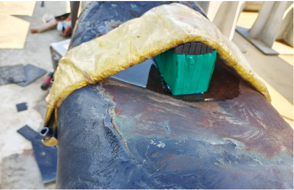 (4)針對嚴(yán)重變形管道泄漏封堵。由于管體的不規(guī)則形變,造成泄漏點在凹陷處,給密封造成了極大的困難,柔性卡具配合“補償塊”的方式就可克服這一難題。在使用“補償塊”對事故管道進行“找回高度、找回圓度”之后(圖 5),再使用柔性卡具進行封堵處理,經(jīng)測試最終承壓可達6.5 MPa,完全滿足恢復(fù)生產(chǎn)的要求。