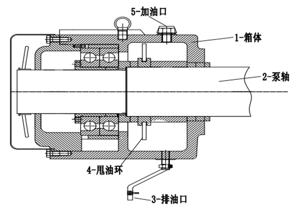 輸油主泵潤滑系統(tǒng)一般由潤滑油箱、加油口、排油口、甩油環(huán)等組成(圖 1),兩端的軸承均安裝在潤滑油箱中并添加適用的潤滑油進(jìn)行潤滑。泵在快速轉(zhuǎn)動(dòng)時(shí),潤滑油會(huì)飛濺到槽內(nèi),通過回油孔流入軸承內(nèi)部,循環(huán)使用,軸承壓蓋和回油孔阻止了潤滑油的滲漏[2]。軸承潤滑方式為油環(huán)甩油潤滑,根據(jù)泵軸尺寸及潤滑油箱油量的不同,甩油環(huán)的工作淹沒油位應(yīng)高出甩油環(huán)的底部3 mm~6 mm。如果低于油環(huán)內(nèi)徑,油環(huán)挑不起油來會(huì)造成軸承潤滑惡化。作業(yè)人員應(yīng)當(dāng)按照規(guī)定檢查輸油主泵潤滑油箱液位及潤滑油質(zhì)量,通過油窗觀察軸承箱內(nèi)潤滑油的油位應(yīng)處于1/2~2/3;如果潤滑油變質(zhì)乳化或者軸承損壞會(huì)造成油質(zhì)變?yōu)槿榘咨蛘吆谏砻鳚櫥褪3],此時(shí)需要更換潤滑油。正常情況下,輸油主泵每運(yùn)行2000 h或長期備用的輸油主泵每半年需清洗泵機(jī)組潤滑油箱,更換潤滑油。潤滑油箱上部設(shè)加油口、底部設(shè)排油口,更換潤滑油時(shí)先排凈舊潤滑油,目前采用人工加注方式。