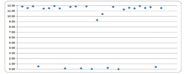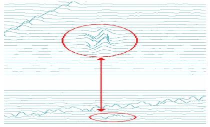 實(shí)際工程應(yīng)用發(fā)現(xiàn),工業(yè)現(xiàn)場(chǎng)管道盜油孔周向位置普遍處于管道頂部09:00~00:30時(shí)鐘方向(圖 2)。在依據(jù)實(shí)際管道檢測(cè)數(shù)據(jù)分析盜油孔時(shí),需要重點(diǎn)對(duì)8:00~4:00(順時(shí)針)即管道頂部的疑似小開孔信號(hào)進(jìn)行篩查,能最大限度排查管道盜油孔。