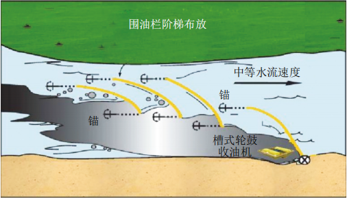 圖 3 圍油欄階梯布放將溢油引導(dǎo)到岸邊回收